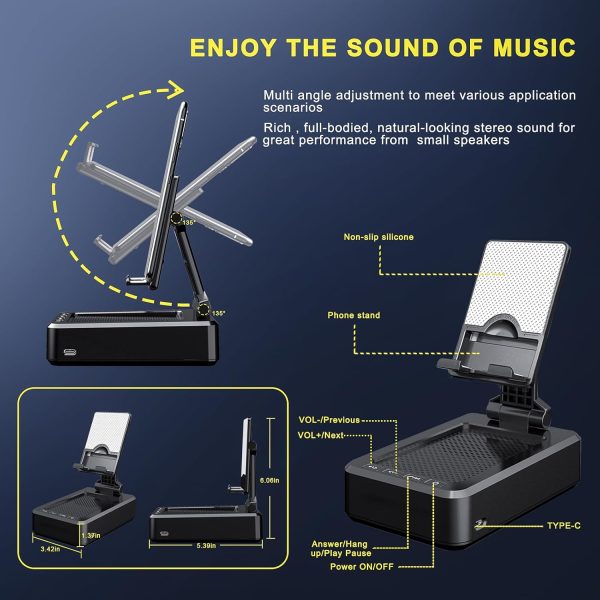 2 in 1 Bluetooth Speaker with Phone Stand:The phone cradle for desk provides you with portable Bluetooth speaker. The wireless Bluetooth speaker delivers stunning sound with enhanced bass, tight mid, and crystal clear highs without distortion at any volume.