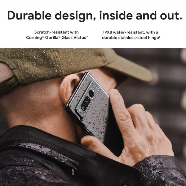 Pixel Fold is scratch-resistant with Corning Gorilla Glass Victus; it’s ready for splashes and spills with IPX8 water resistance, and it has a durable stainless steel hinge[6]