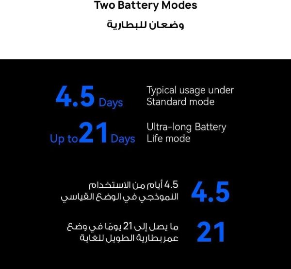 【Durable Battery】Standard Mode: 4.5-day typical battery life, 3-day max. battery life (with AOD on);Ultra-long Battery Life mode:12-day typical battery life,21-day max. battery life